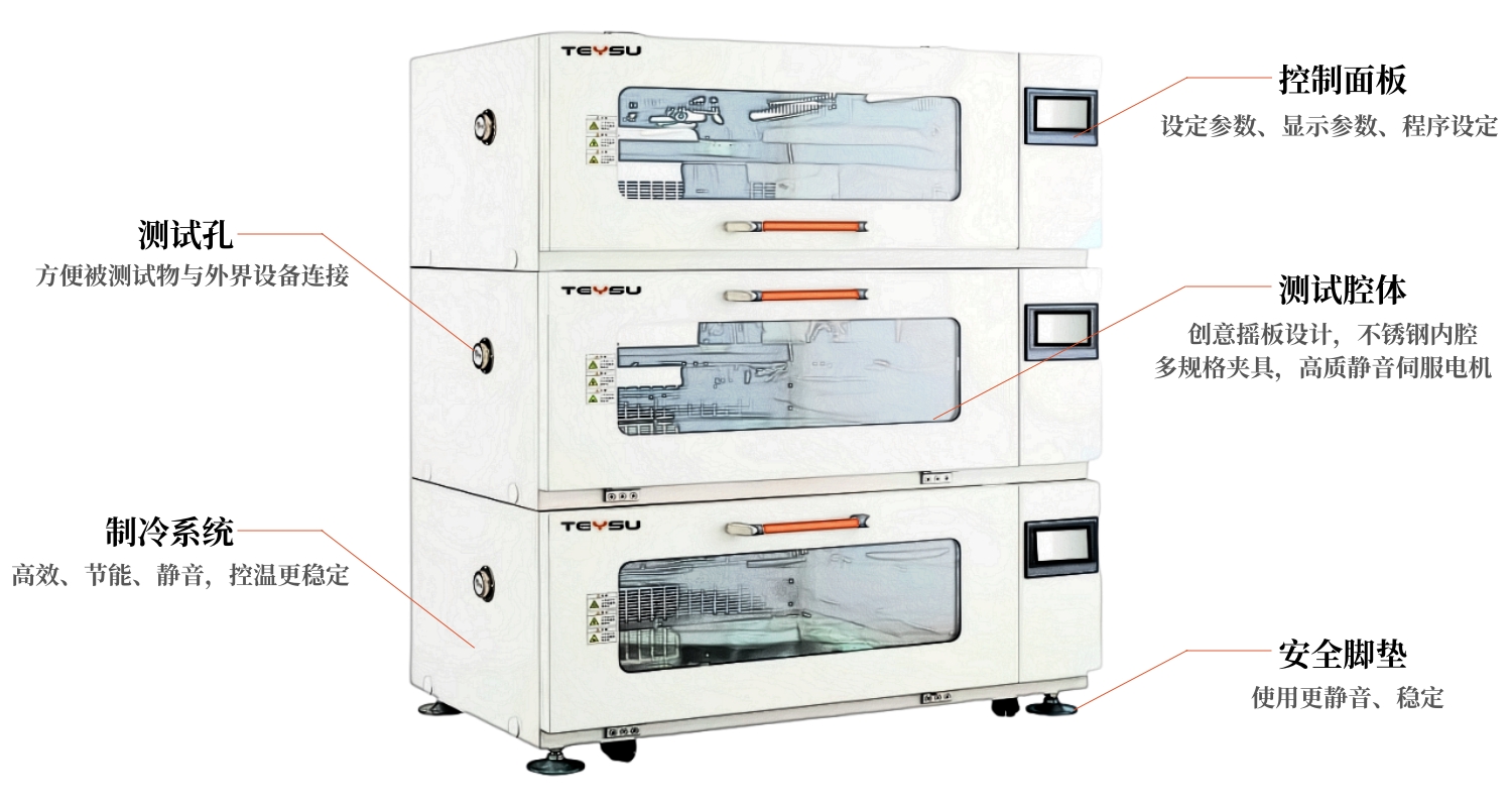 ∎產品具有占地面積小、多層疊加、每層具有獨立參數控制系統。根據用戶需求,每層單獨設定所需要的參數來實現多參數實驗的目的。 ∎疊加式振蕩培養箱導軌抽拉式托盤,更加方便放置培養器具。三層疊加具備大量的樣品實驗要求。 ∎產品可以實現動態培養,也可以實現靜態培養。 ∎控制部分采用真彩屏觸摸操作,觸摸靈敏度高。界面簡單易懂,便于操作。 ∎系統采用MCU單片機 ,P.I.D微電腦參數匹配處理,得到一個穩定的參數值,為實驗工作保駕護航。 ∎系統具有斷電恢復、參數記憶、時鐘顯示、定時運行、溫度顯示、轉速顯示、參數密碼保護等功能。 ∎產品具有門控制斷電開關功能,人性化的設計避免誤傷操作人員。 ∎機芯的設計選用獨立的三維驅動系統,使得托盤平穩的回旋移動。確保了實驗器具樣品混勻的均勻性。 ∎機芯的動力采用訂制款無刷電機,降低轉速的誤差值,以確保傳動的均勻性。 ∎傳動系統使用日本三星三角帶,軸承采用哈軸,確保傳動系統的壽命。 ∎主軸偏心轉盤采用優質鍛造鋼構成,電機轉盤采用鋁質構造,此兩種材料在旋轉過程中可以相互制約,達到旋轉的穩定性。 ∎大小轉盤采用齒輪比的有效計算方式,保證了振蕩轉速的每分鐘的轉動次數。 ∎內膽采用SUS304拉絲不銹鋼,四棱角為弧形,確保內膽的清潔。 ∎內膽跟外殼銜接流水槽,可用水沖洗清潔。 ∎器具放置板為邊角都經過打磨拋光處理的5052鋁板或SUS304不銹鋼平板。